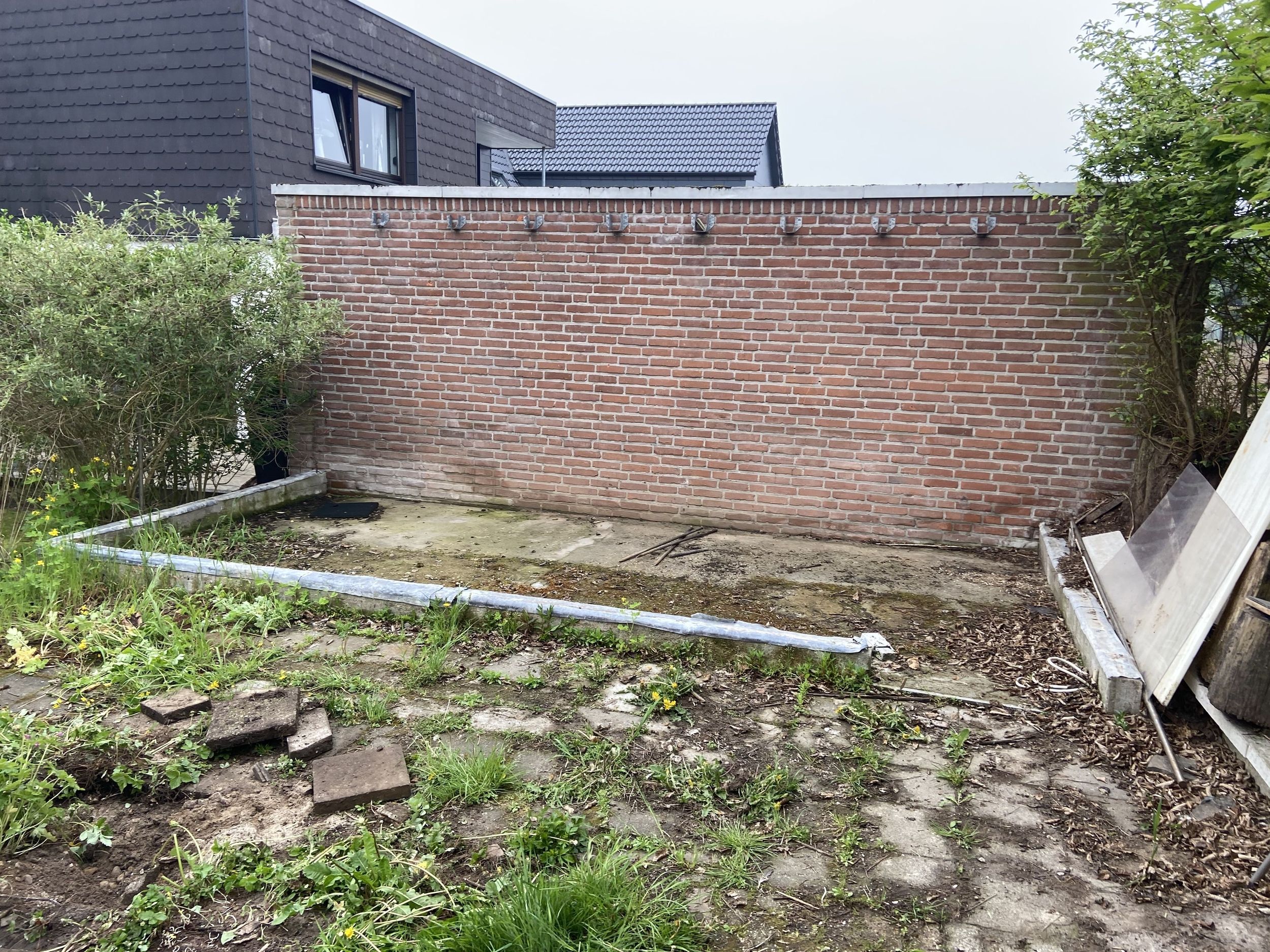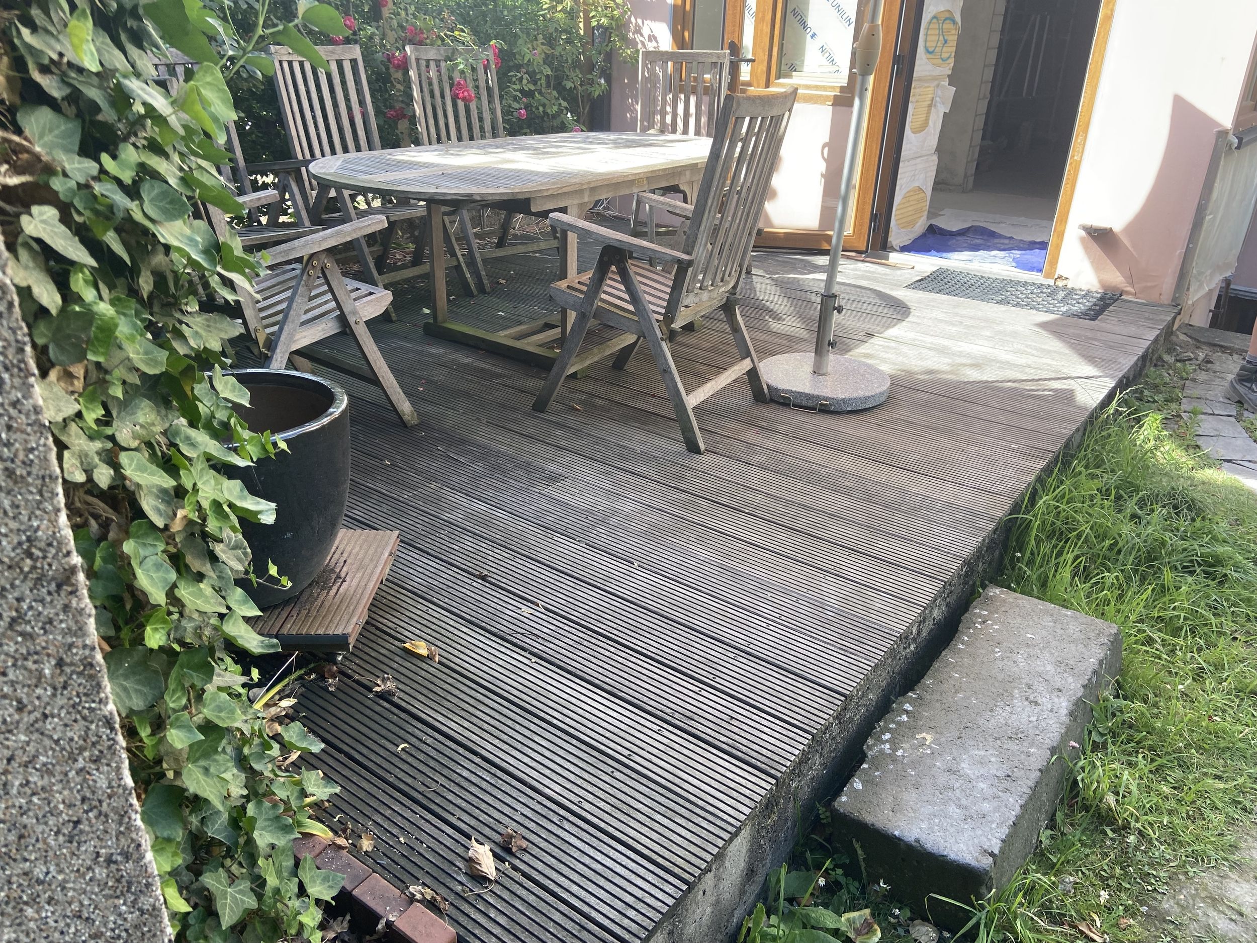 Terrasse aus Klinker und Keramik Platten, eingefasst mit einer Trockenmauer